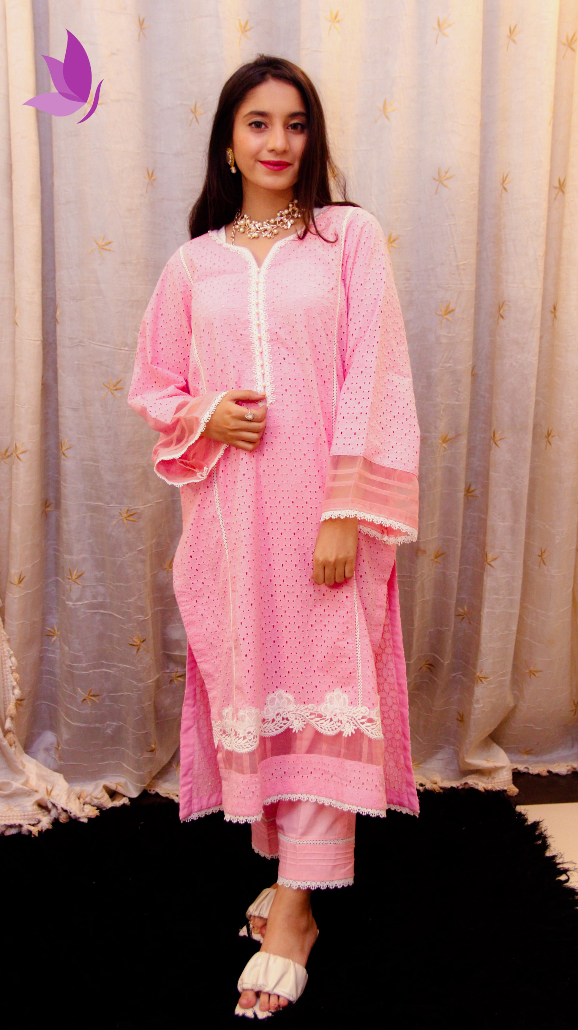 Radiate timeless elegance with our Blush Serenity 2-piece ensemble — a delicate fusion of charm and sophistication. Crafted from breathable schiffli cotton, this outfit features intricate all-over embroidery and a feminine silhouette that exudes effortless grace.
