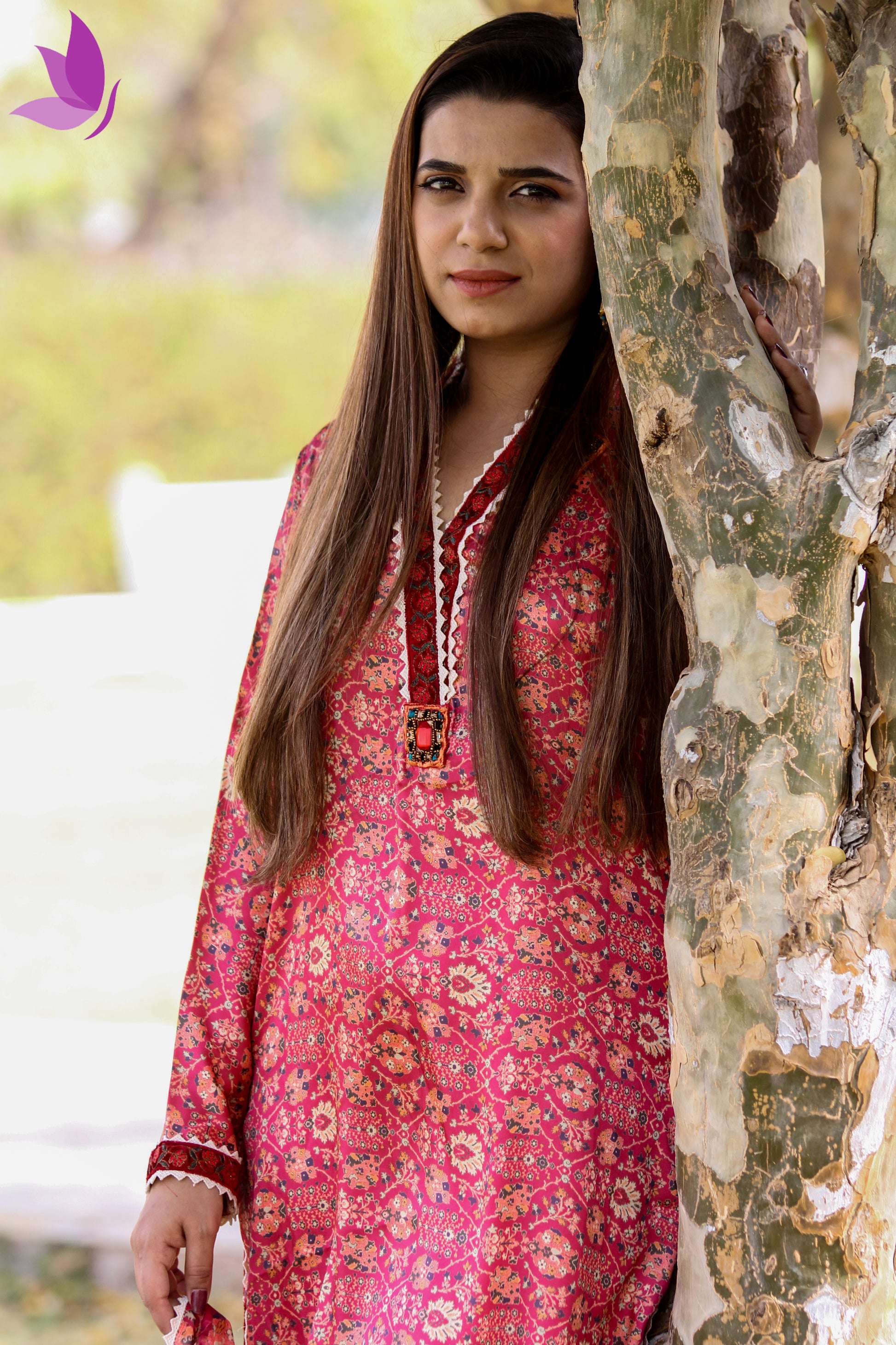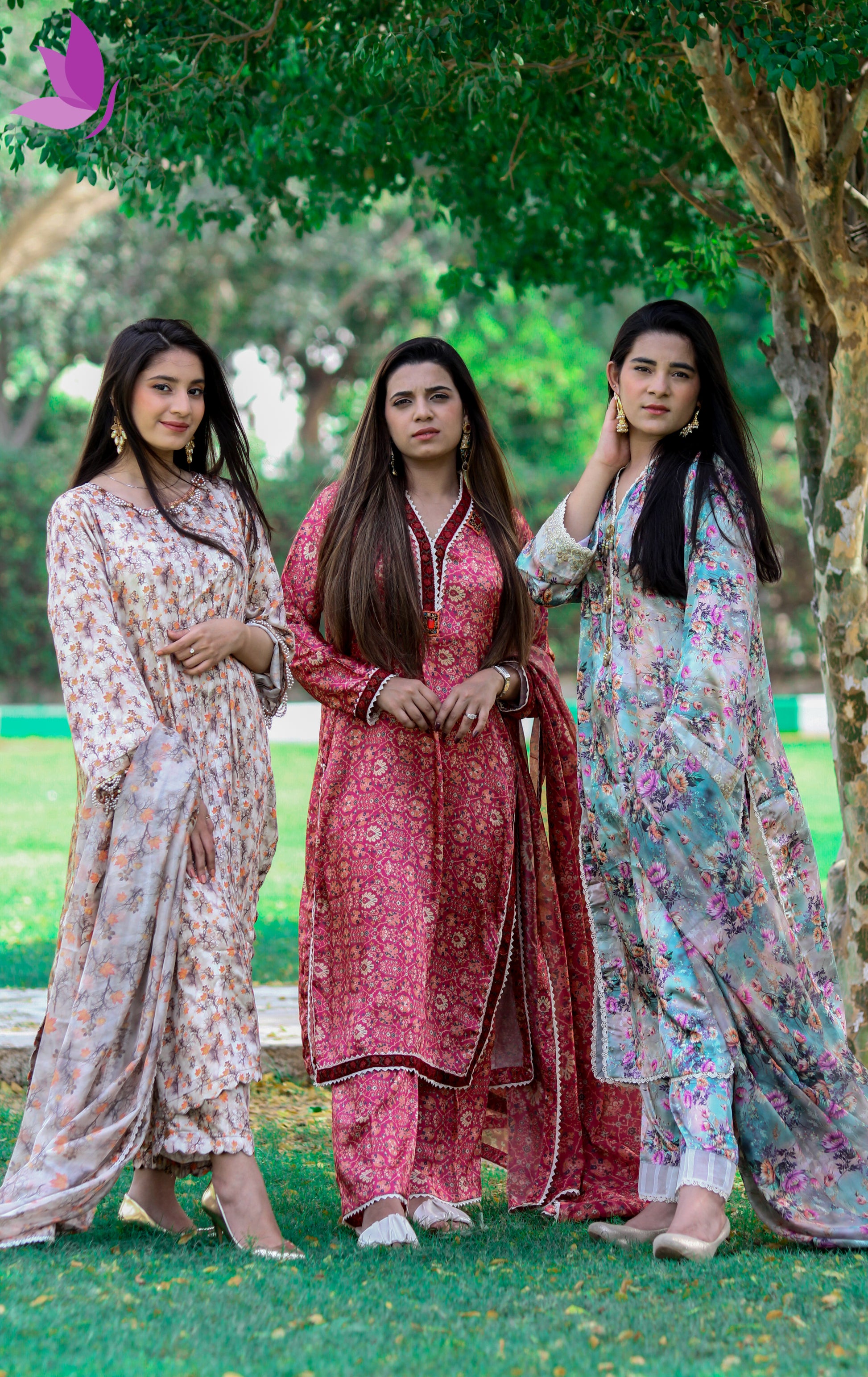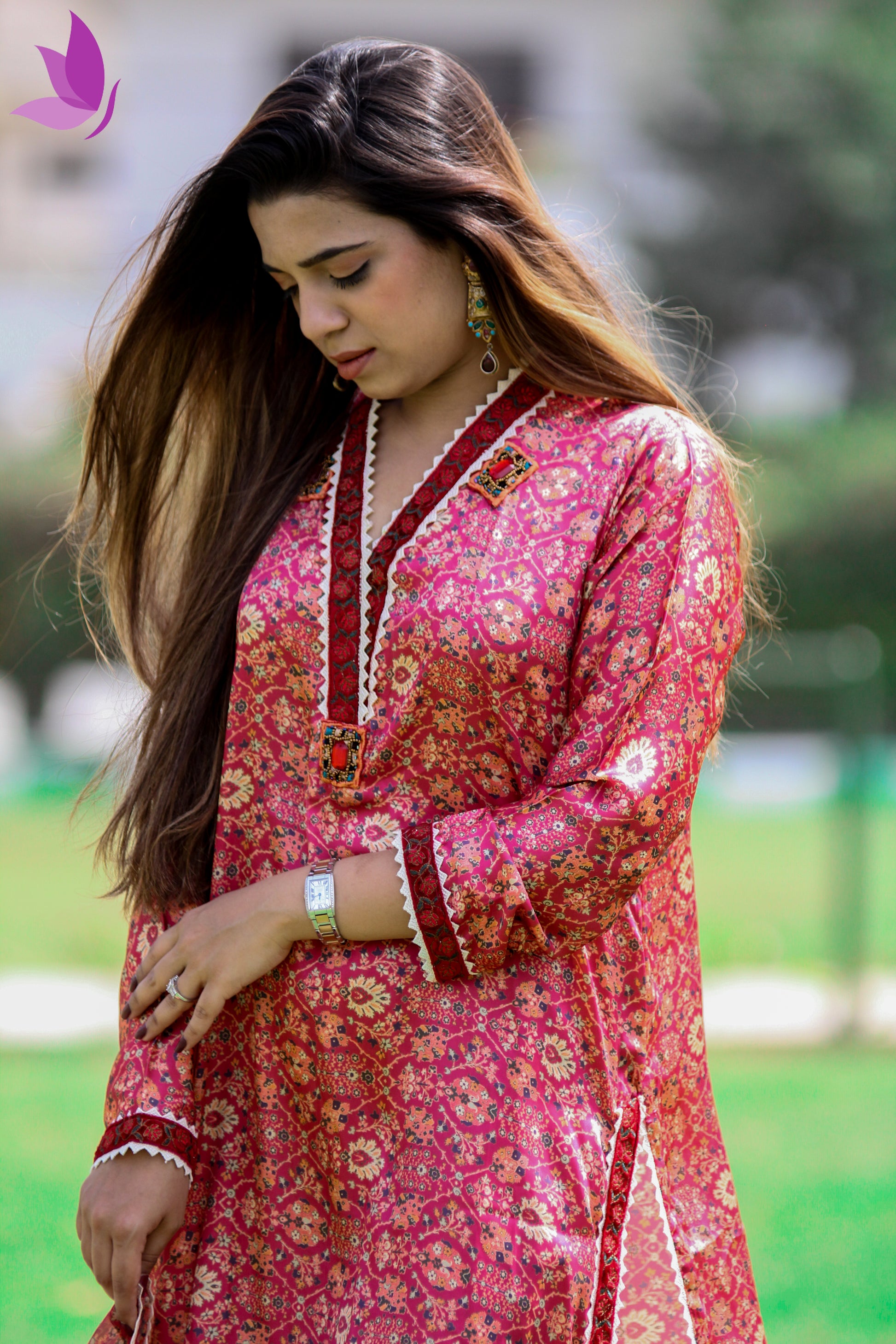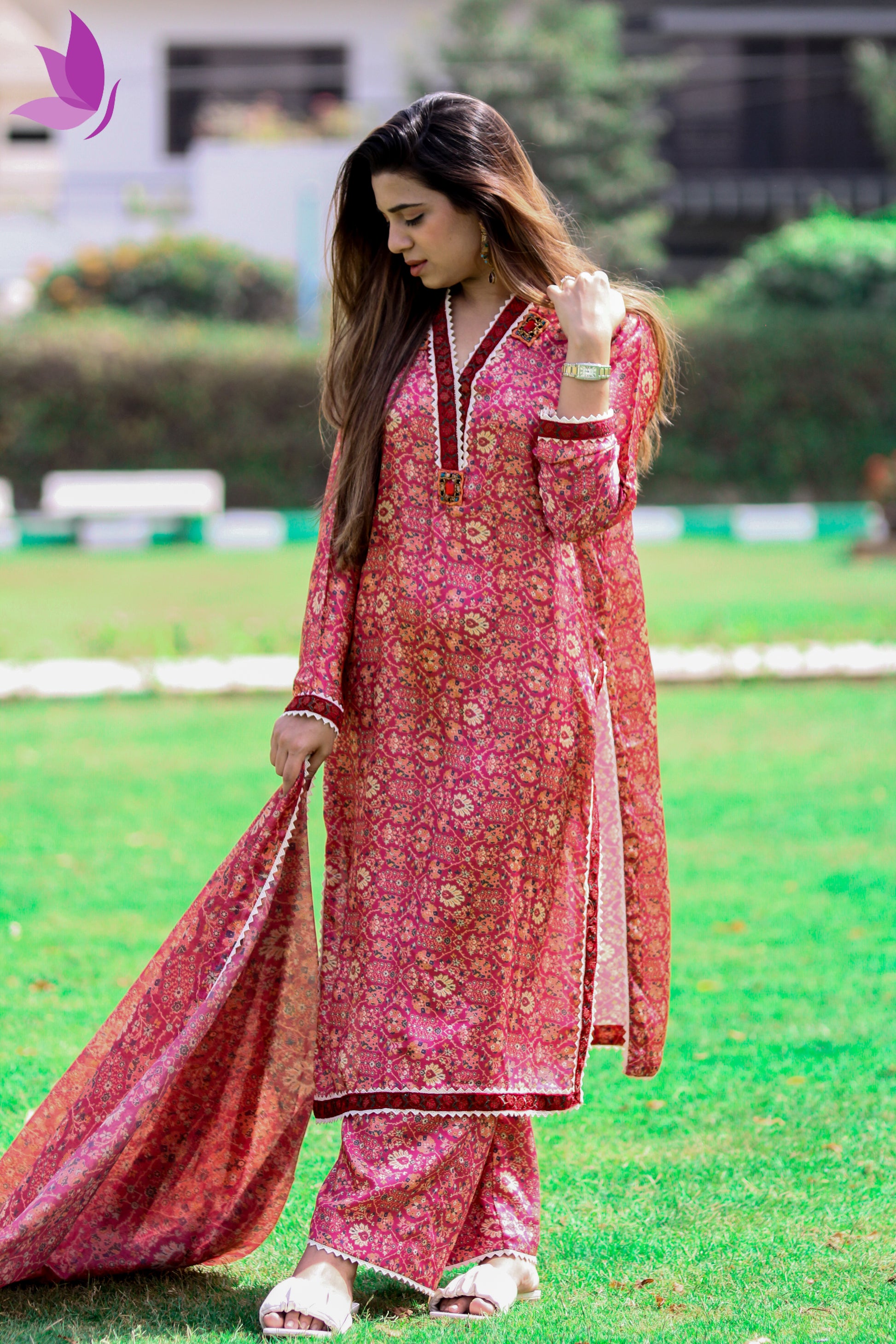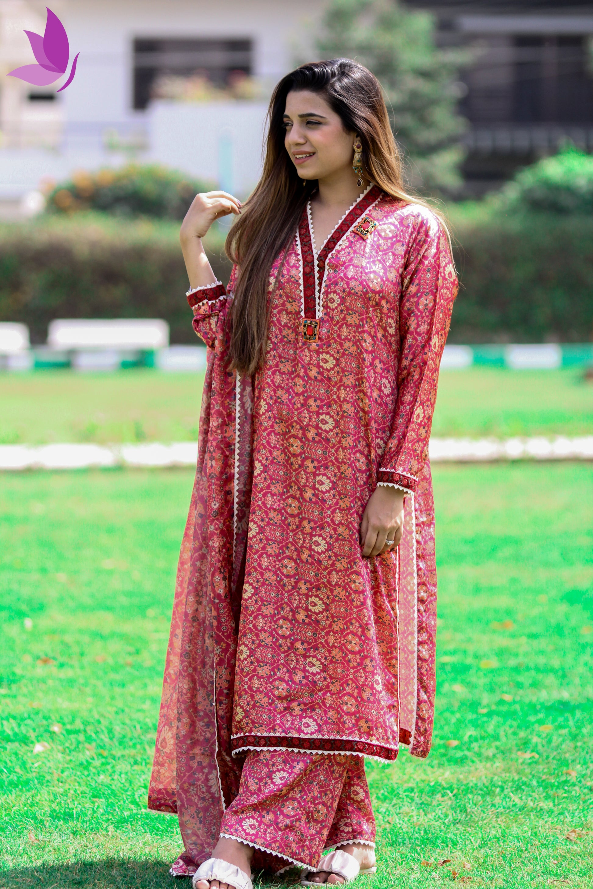 Radiate confidence and charm in the Deep Coral Silk Ensemble, a symphony of warmth and elegance. Crafted from premium silk, this flowing outfit blooms with intricate floral prints in coral and blush tones — evoking the beauty of a summer garden at dusk.