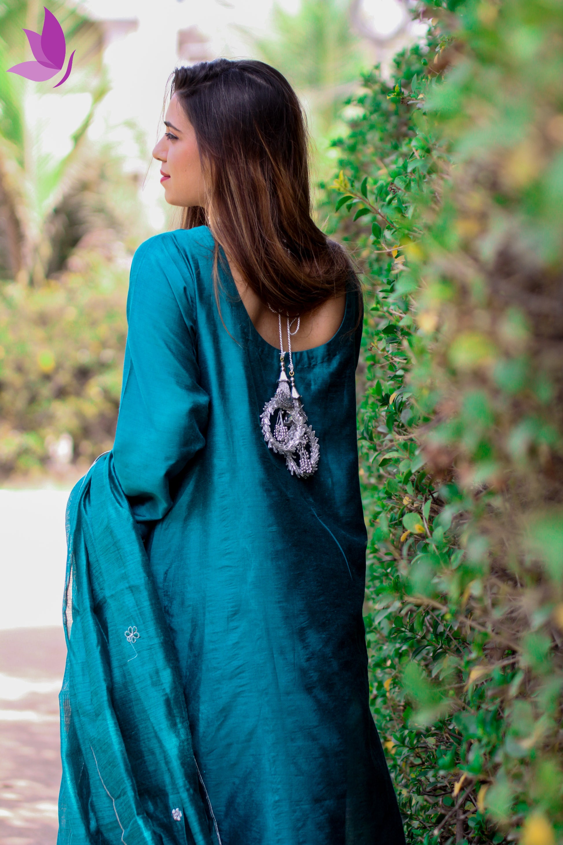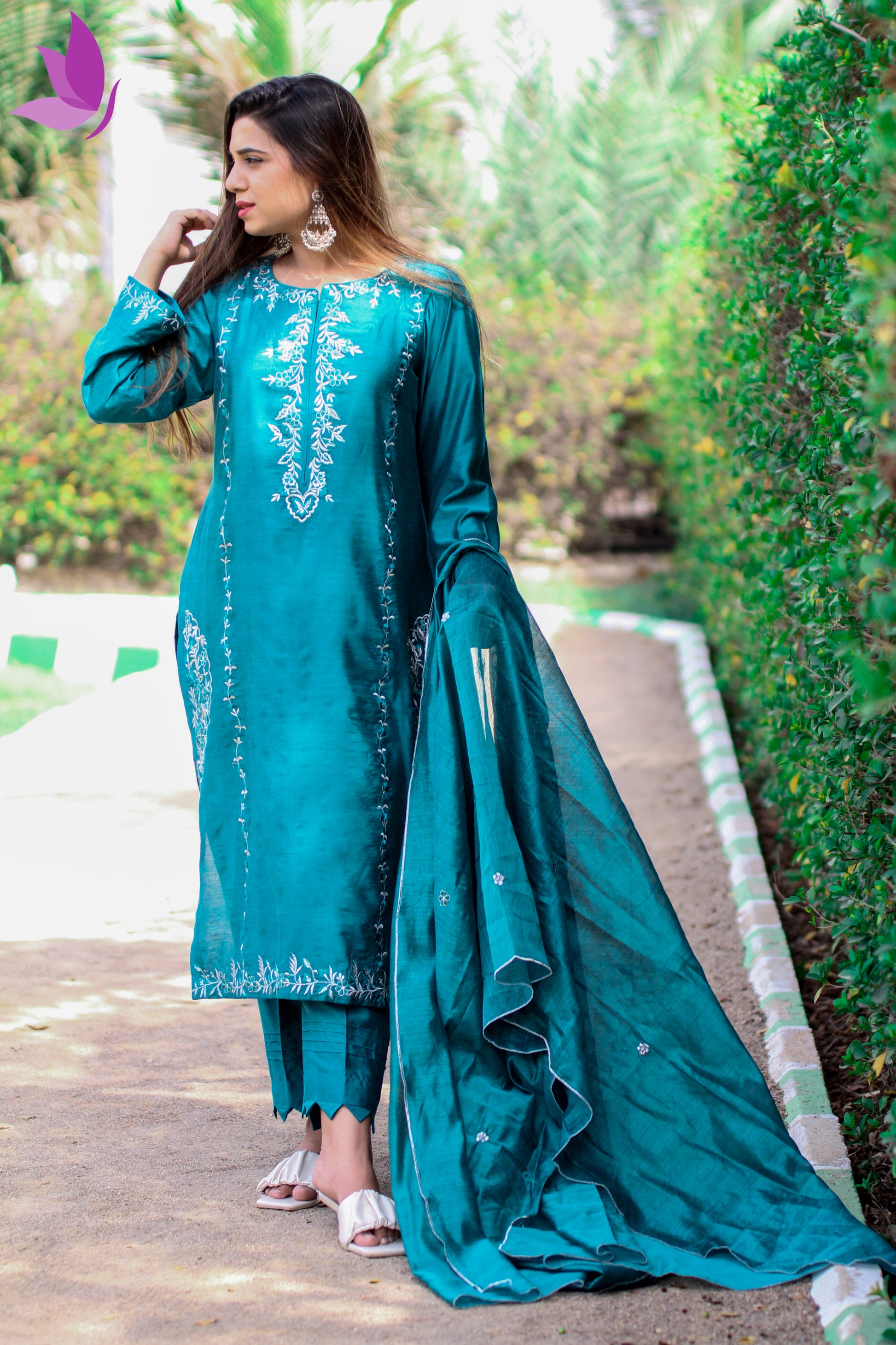 Dupatta: Teal silk with embroidered edges