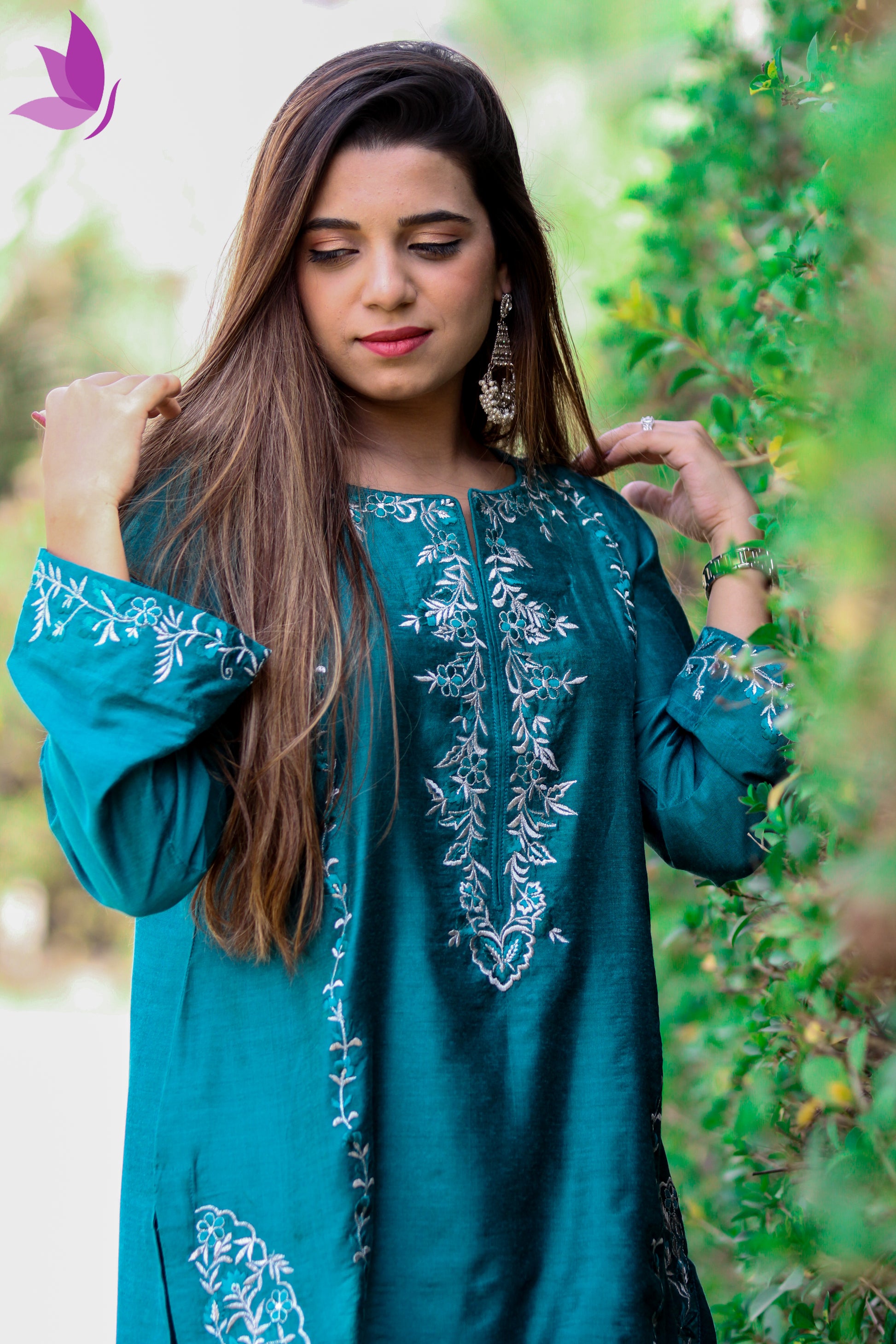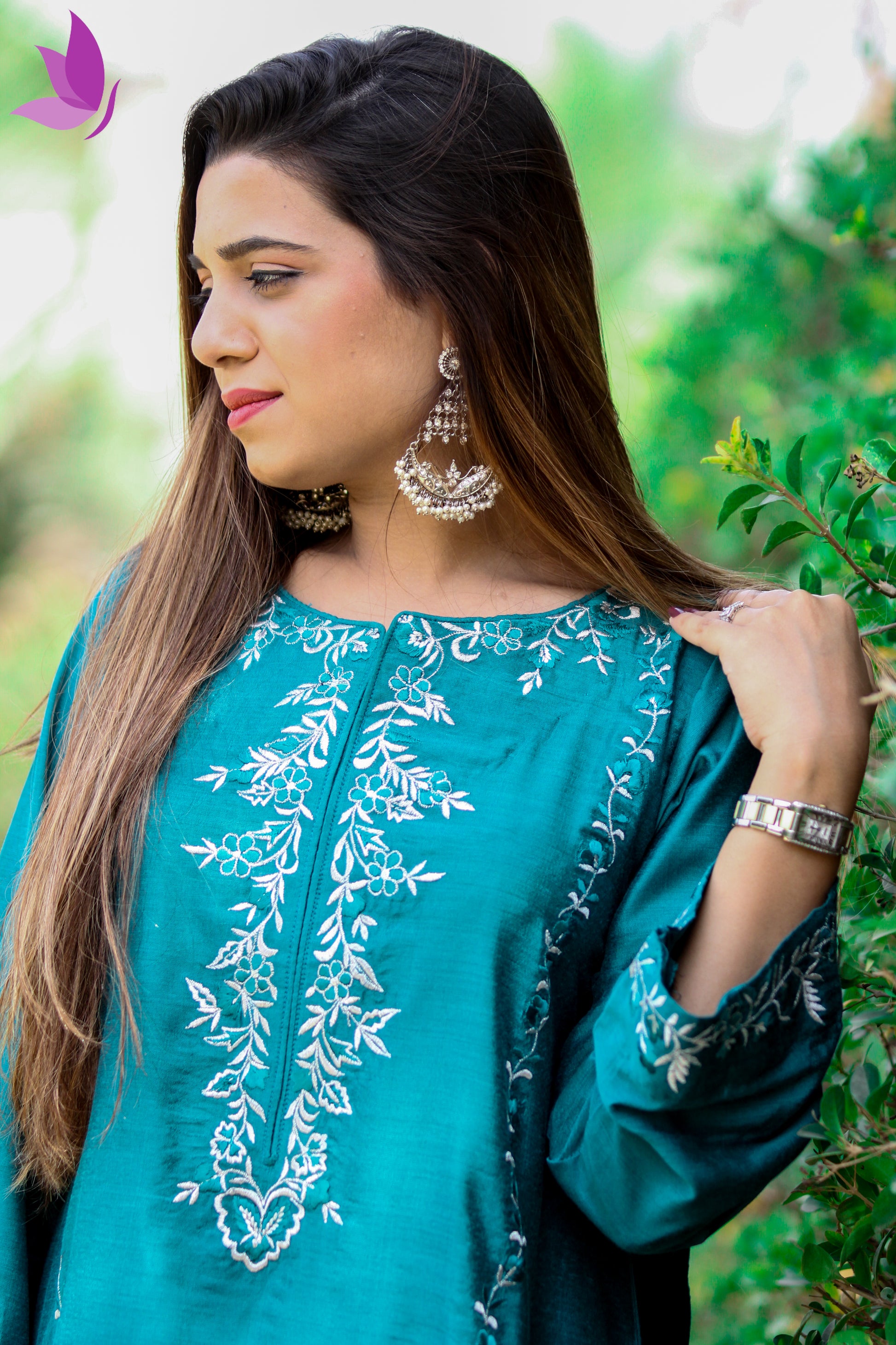 Exuding poise and sophistication, the Teal Serenity Embroidered Suit is a true ode to modern elegance. Its deep teal base in lustrous silk provides the perfect canvas for intricate ivory thread embroidery, artfully framing the neckline and sleeves.