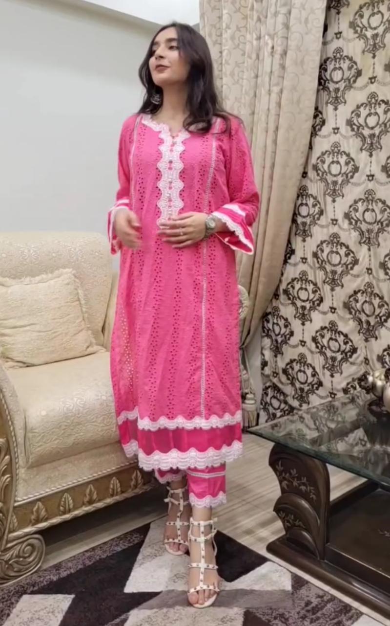 Add a pop of color to your wardrobe with this stunning pink embroidered 2-piece outfit, crafted from breathable lawn fabric. Designed with intricate white lace detailing on the neckline, sleeves, and hem, this dress beautifully blends elegance with comfort. Perfect for casual gatherings, daytime outings. Pair it with your favorite sandals or heels to complete the look.