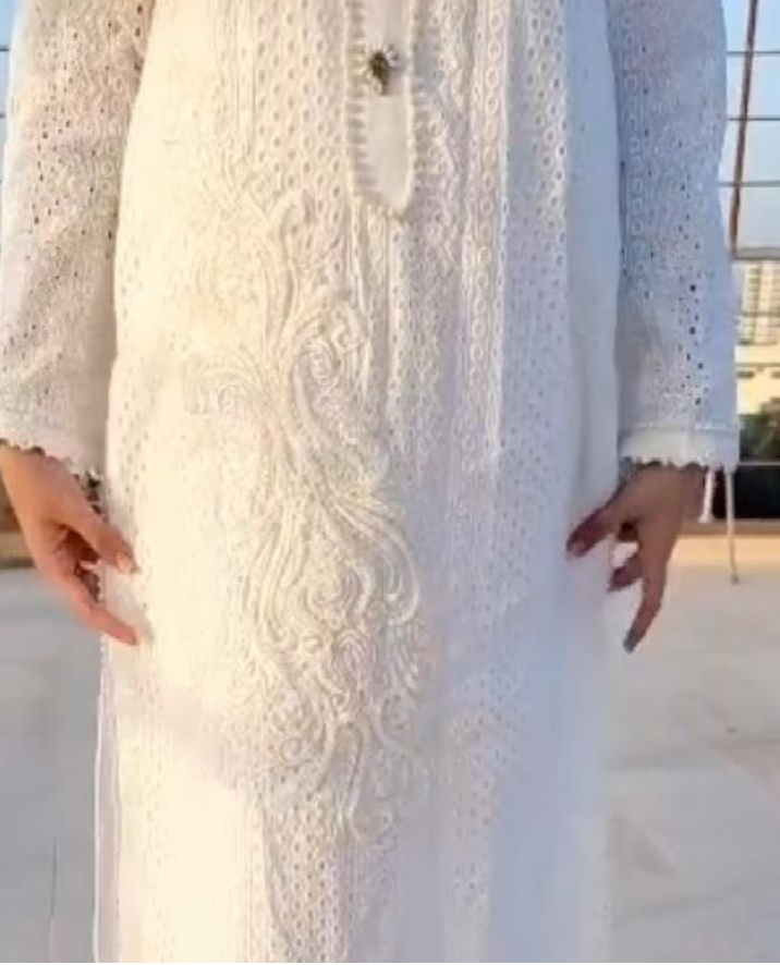Fabric: Made from a premium Chikankari, featuring delicate, intricate perforations and subtle self-embroidery that adds beautiful texture and dimension.