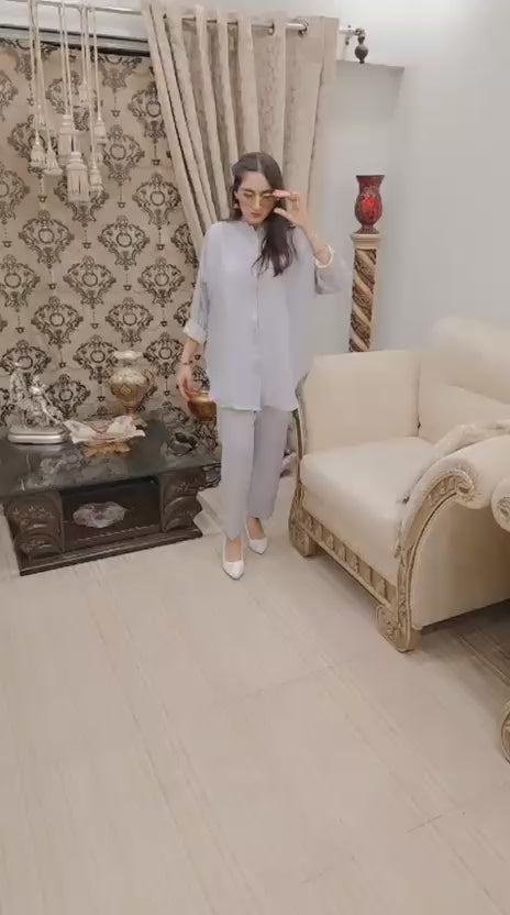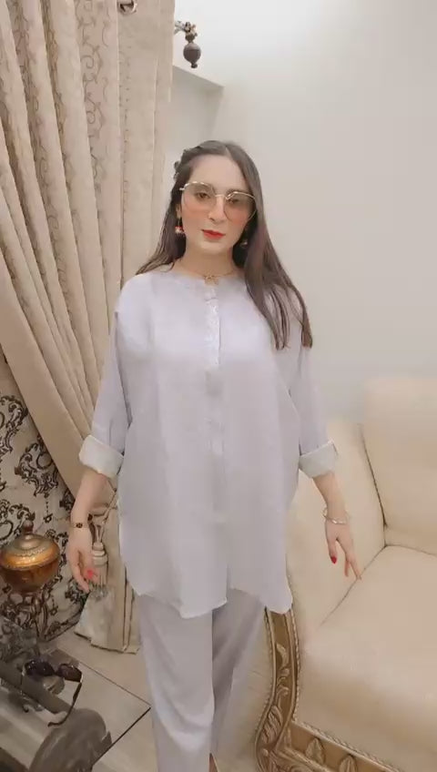 The shirt features a mandarin collar and a clean, placketed front, complemented by slightly dropped shoulders and wide, cuffed sleeves for a contemporary silhouette. Paired with straight-cut trousers in the matching fabric, this set defines effortless style and versatility.