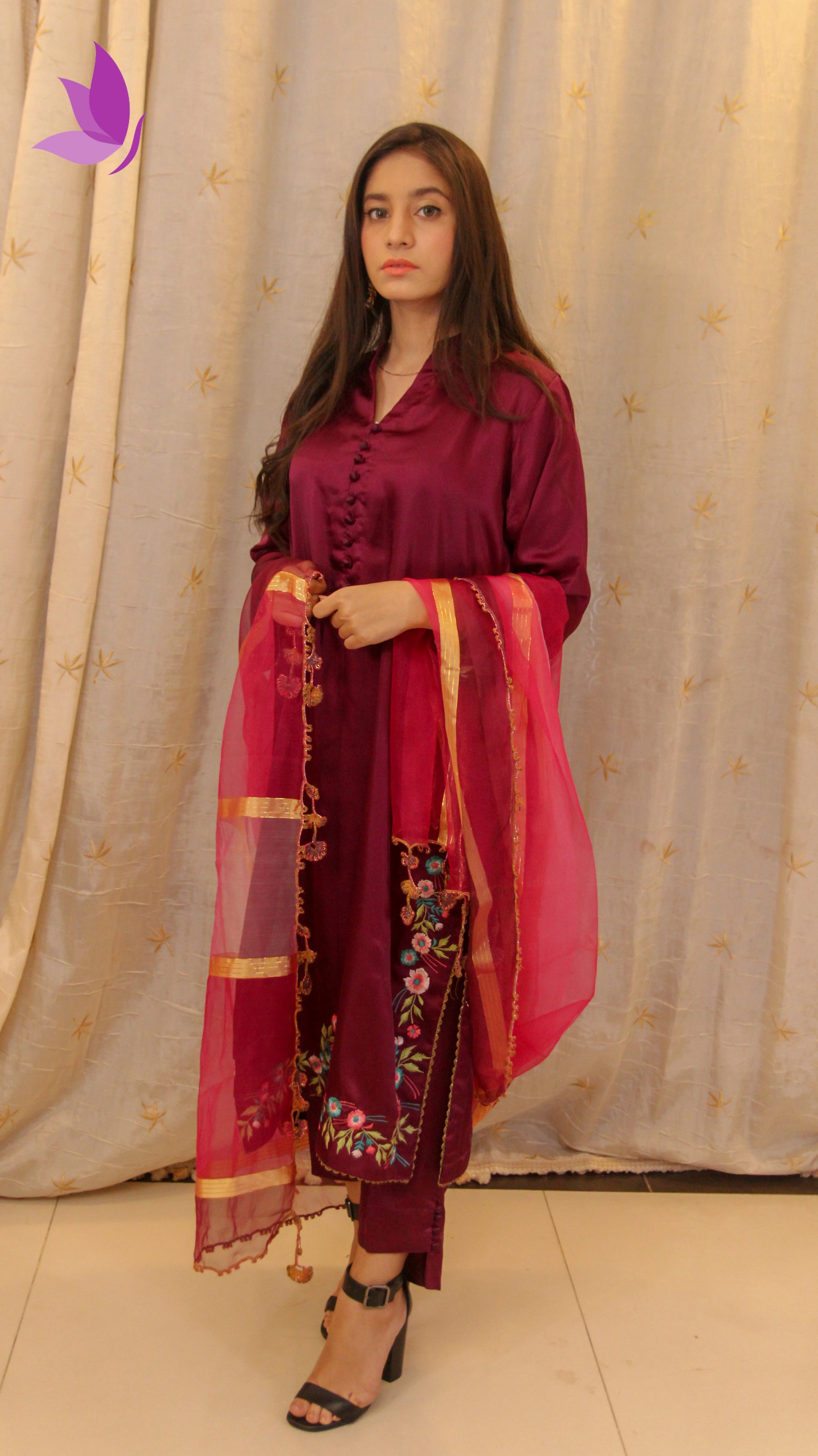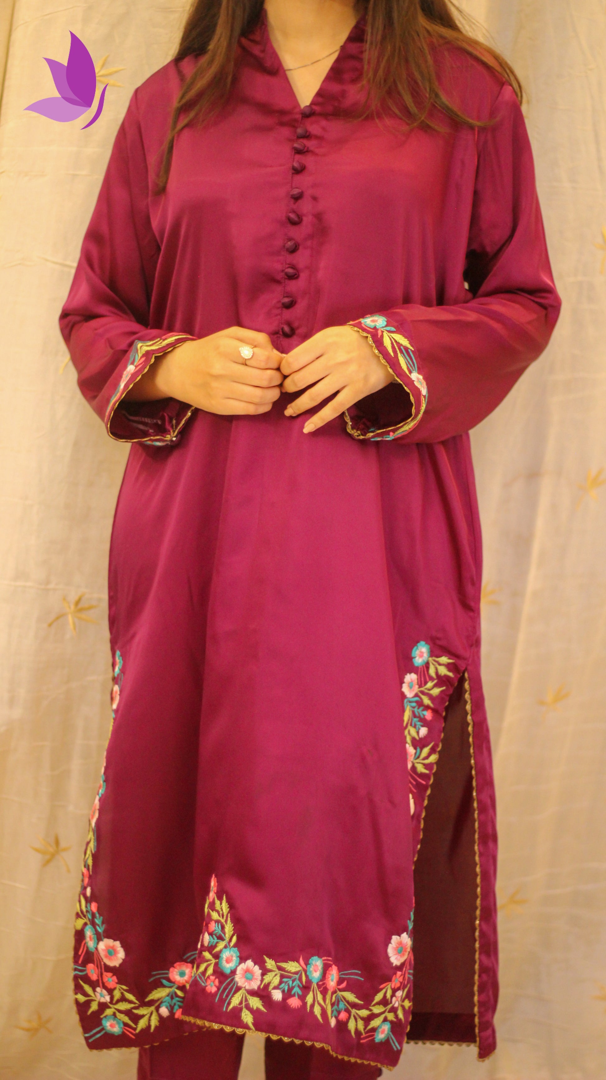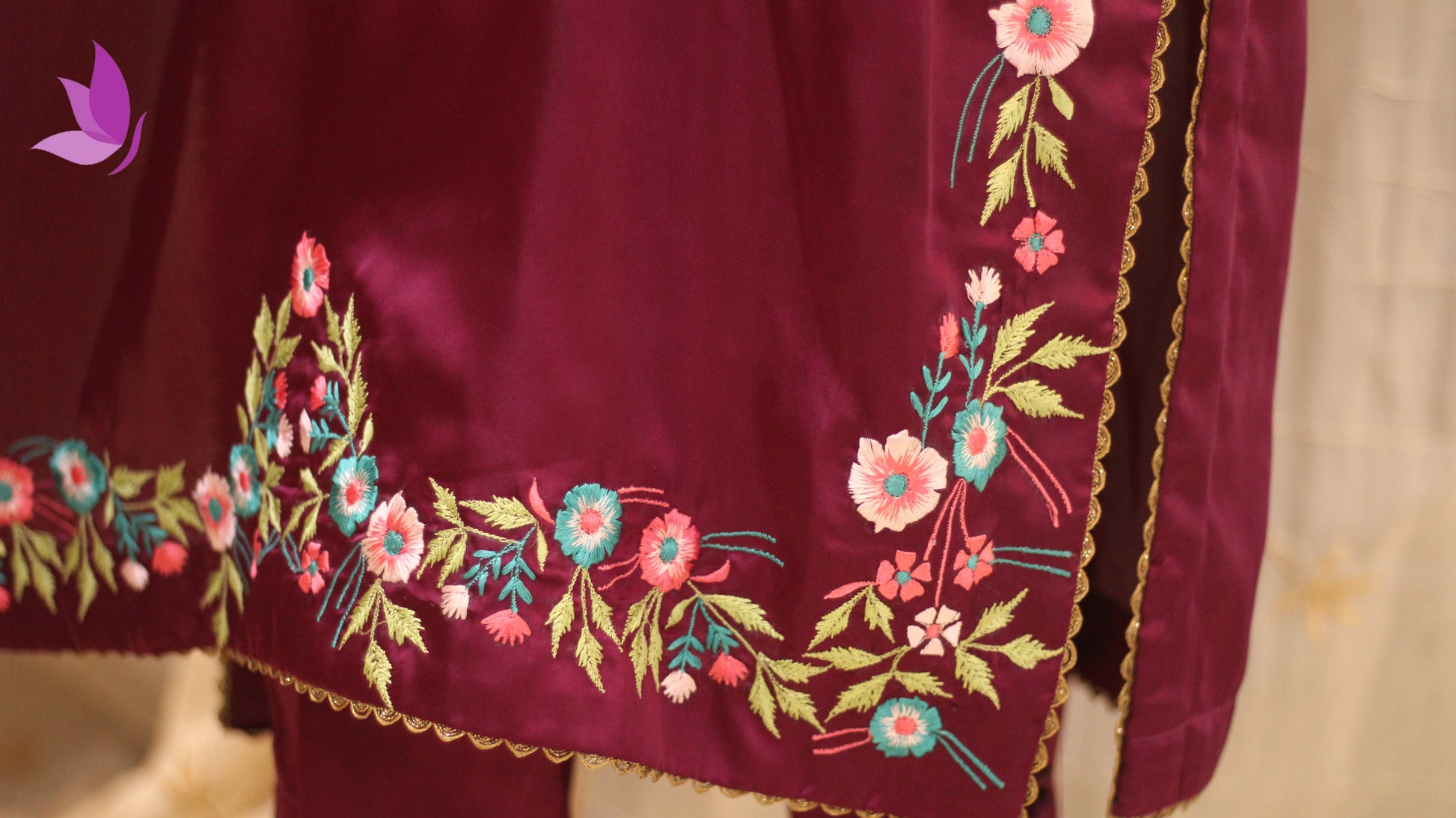 The rich maroon shirt features delicate fabric buttons down the neckline, paired with straight trousers adorned with intricate multicolor floral embroidery that adds a graceful touch.