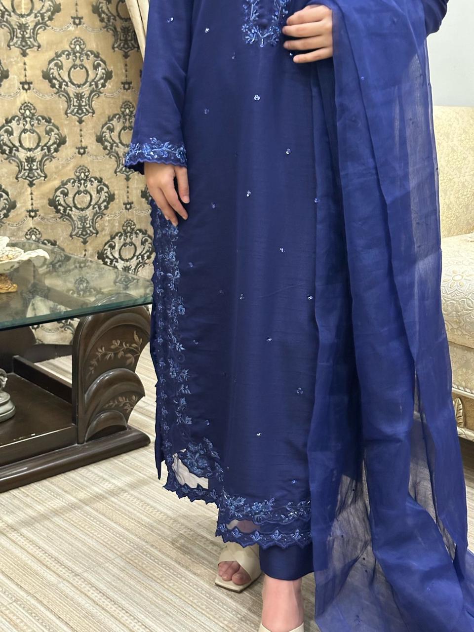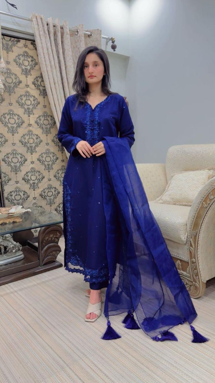 Style: Three-piece set (embroidered shirt, plain trousers, organza dupatta)