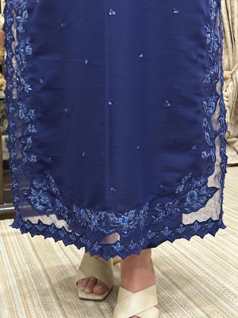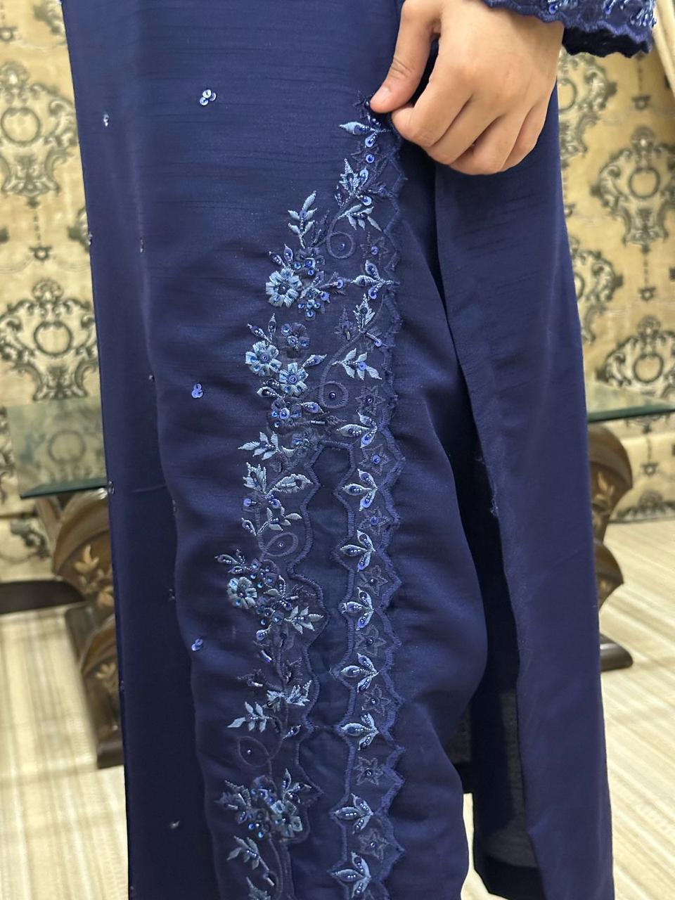 Exude effortless elegance in this navy blue three-piece outfit, expertly designed to strike a perfect balance of simplicity and sophistication. The shirt is adorned with delicate tonal embroidery along the neckline, sleeves, and borders, paired with subtle scattered motifs for a graceful finish. Making it versatile for both formal and semi-formal occasions.