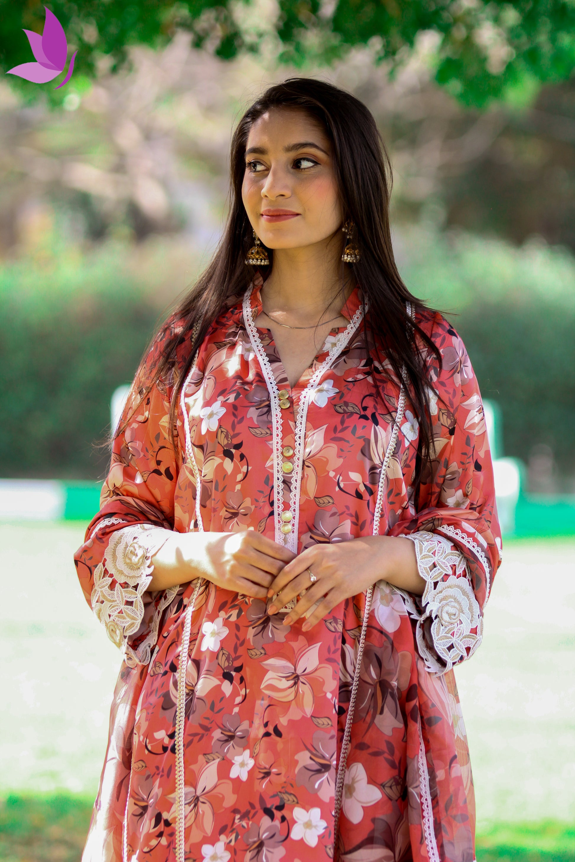 Delicate lace detailing along the neckline and sleeves adds a touch of romantic elegance, while the fluid silhouette ensures a graceful drape that flatters every form. The intricate floral print and subtle sheen of silk create a look that’s effortlessly refined yet refreshingly contemporary.