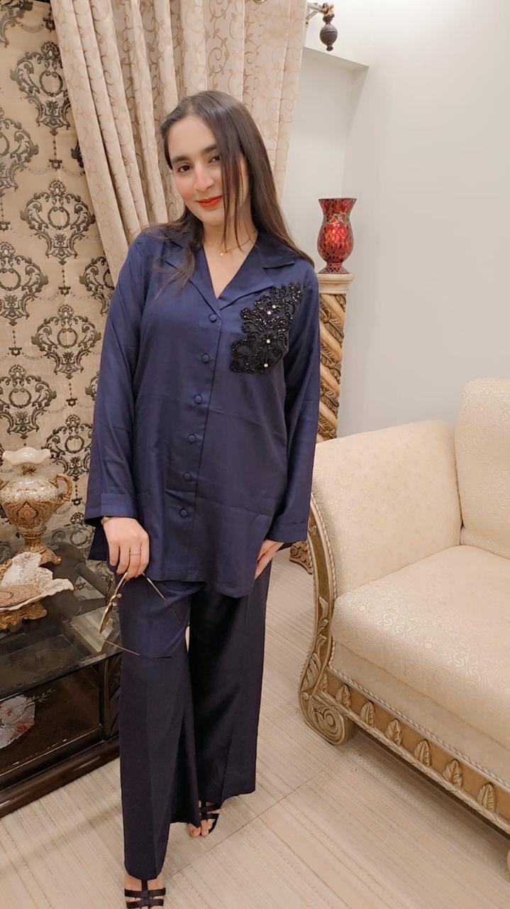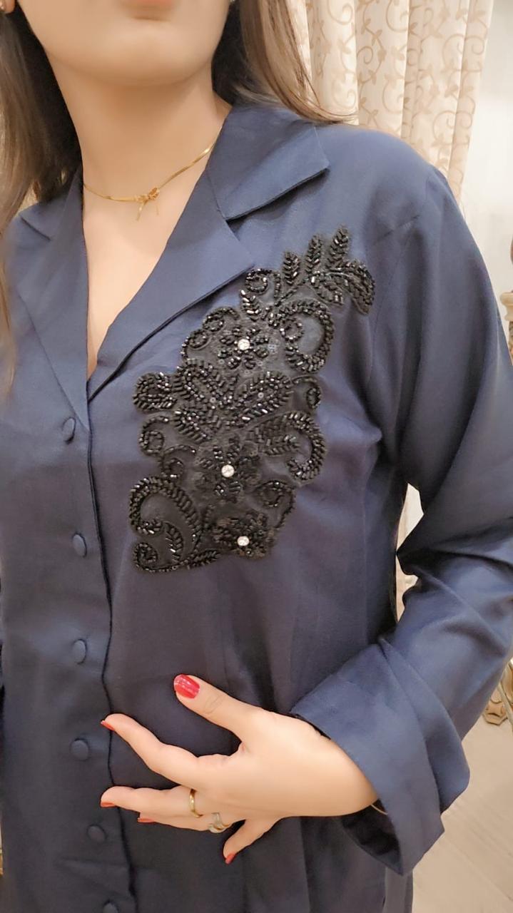 Effortlessly chic and versatile, this navy blue semi-formal co-ord set is designed for women who love to stay stylish without compromising on comfort. Crafted from premium fabric, the set features a button-down long shirt with a flattering, relaxed fit, paired with wide-leg trousers for a modern and elegant look.