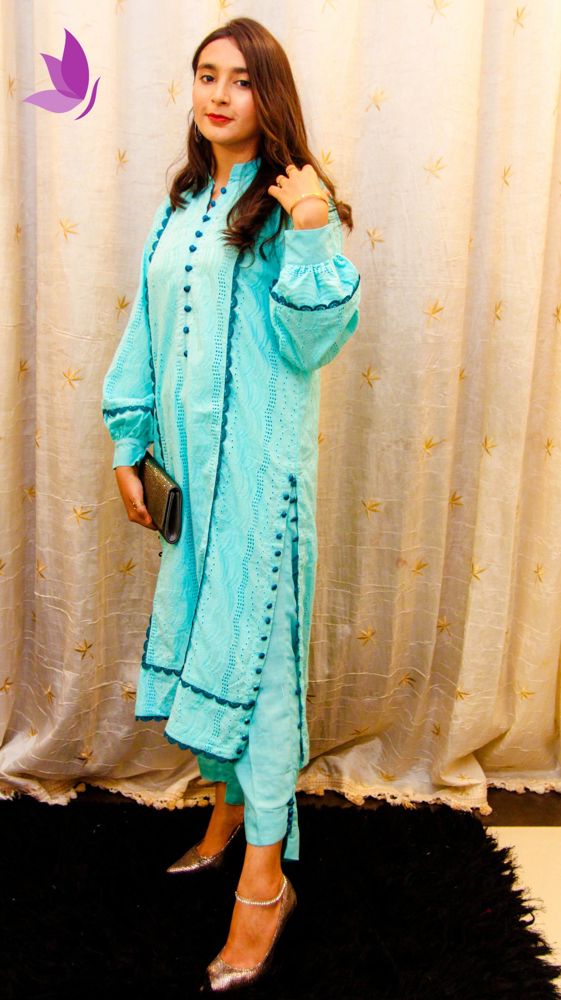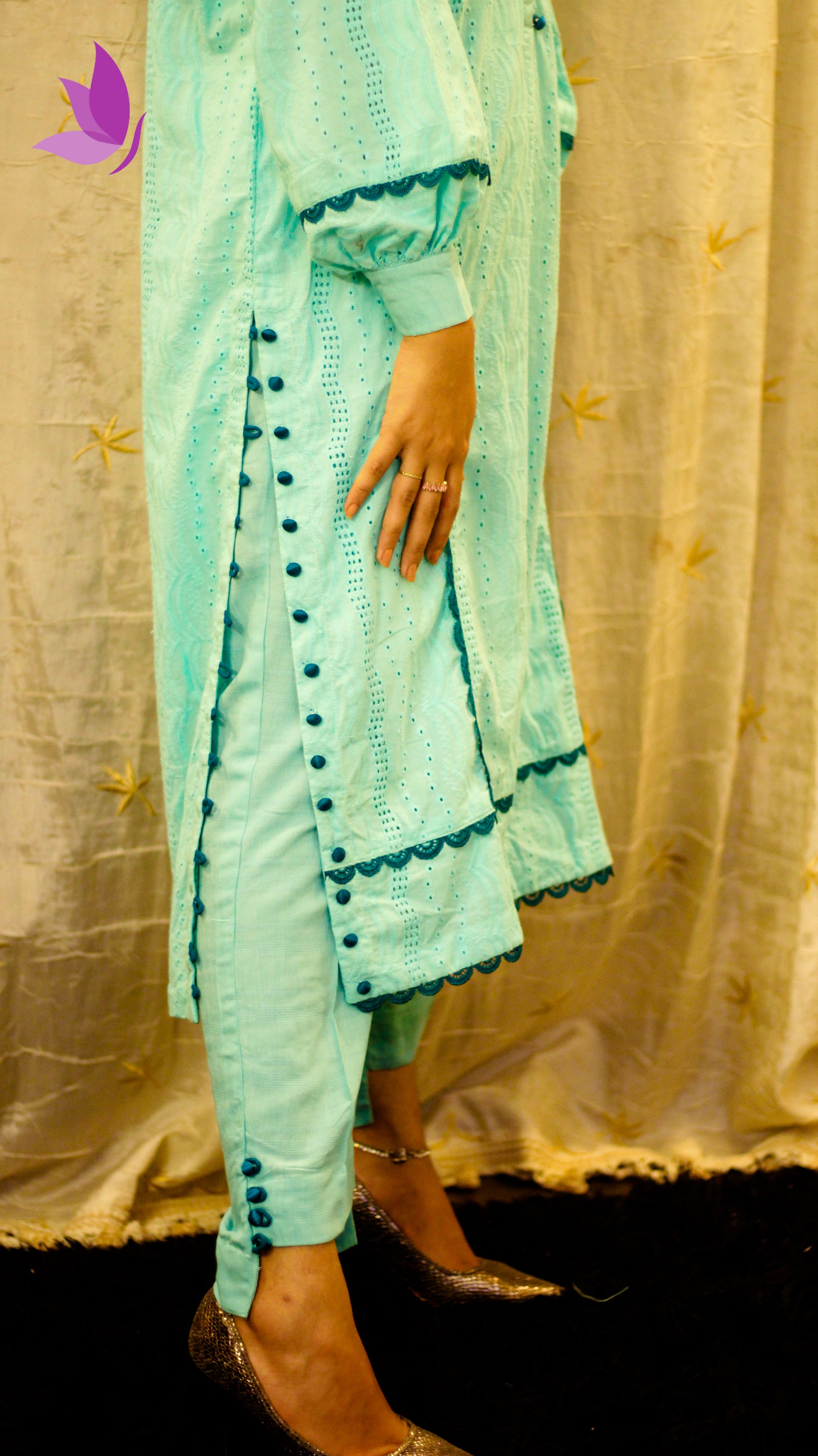 Crafted in a refreshing aqua-blue shade that radiates charm and poise. The kurta features delicate embroidery with fabric-covered buttons, scalloped detailing, and a modern straight cut for a graceful silhouette. Paired with matching trousers, this outfit is perfect for semi-formal gatherings, festive dinners, or daytime occasions where you want to stand out with subtle elegance.