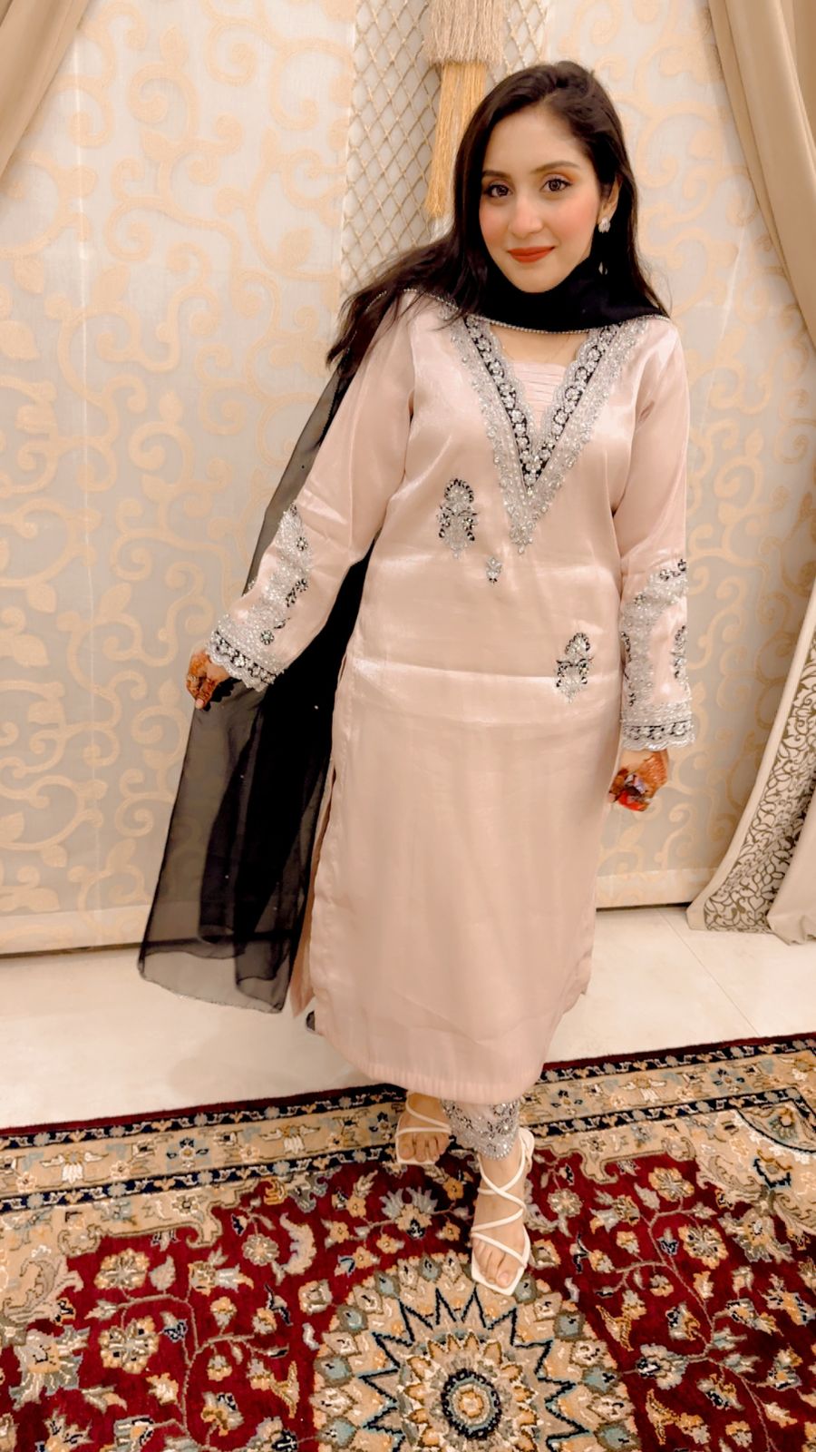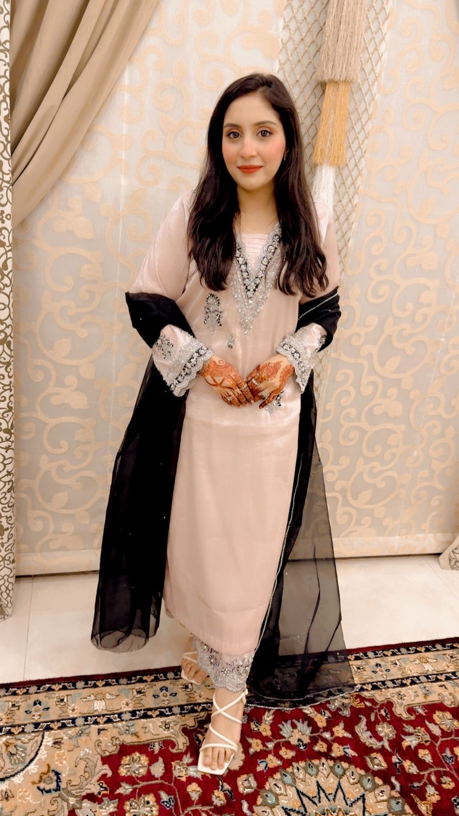 The look is completed with matching trousers featuring embroidered lace hems and a contrasting black organza dupatta, adding a striking balance of grace and boldness. Every element of this outfit speaks sophistication — from the shimmer of embellishments to the fluid drape of the dupatta.