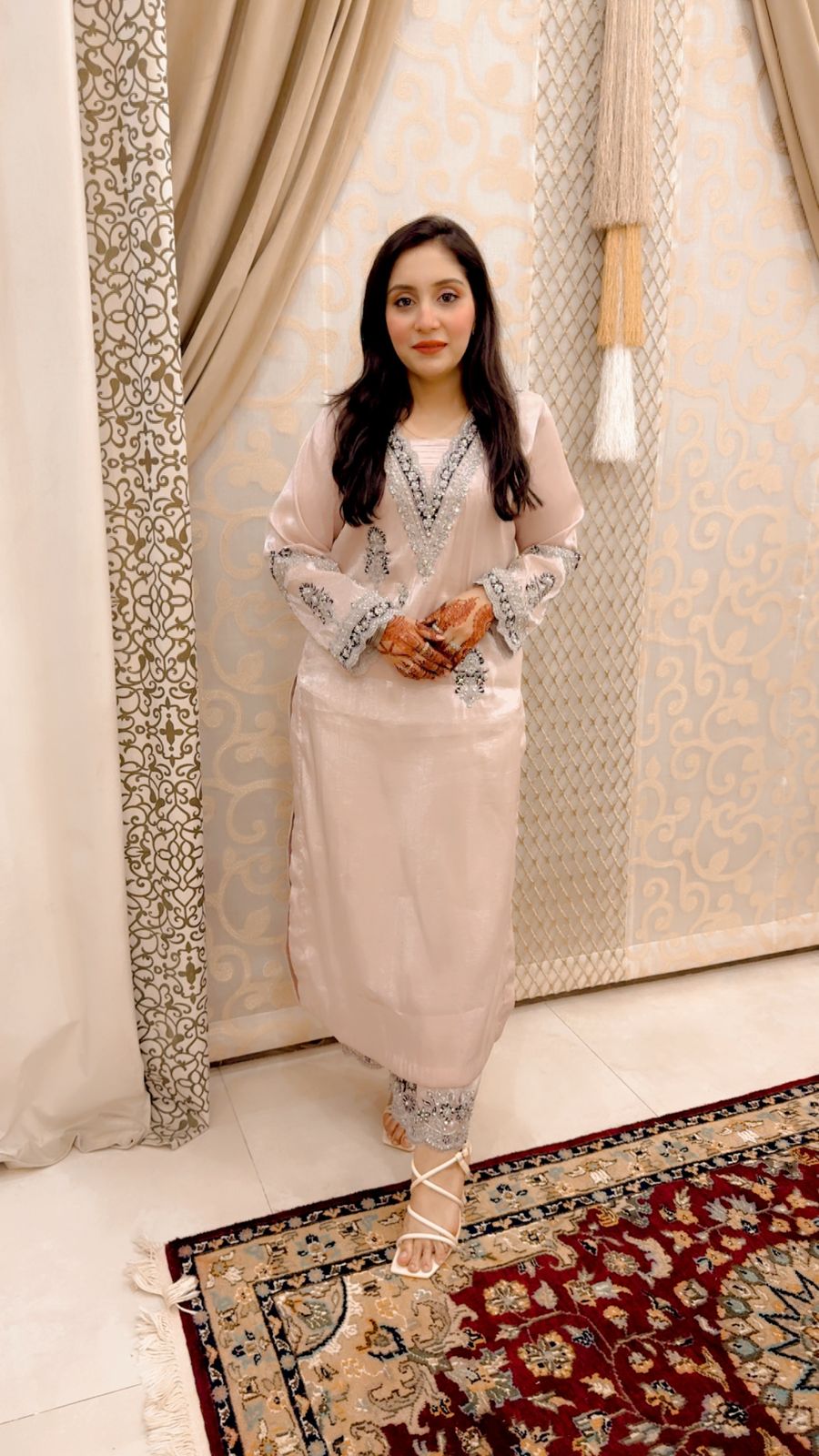 Crafted from premium cotton silk, the soft blush pink base is adorned with hand-embellished neckline and sleeve cuffs, featuring a delicate play of silver sequins, crystal beads, and thread embroidery. The intricate craftsmanship adds a regal touch, making it perfect for festive dinners, wedding soirées, or formal occasions.
