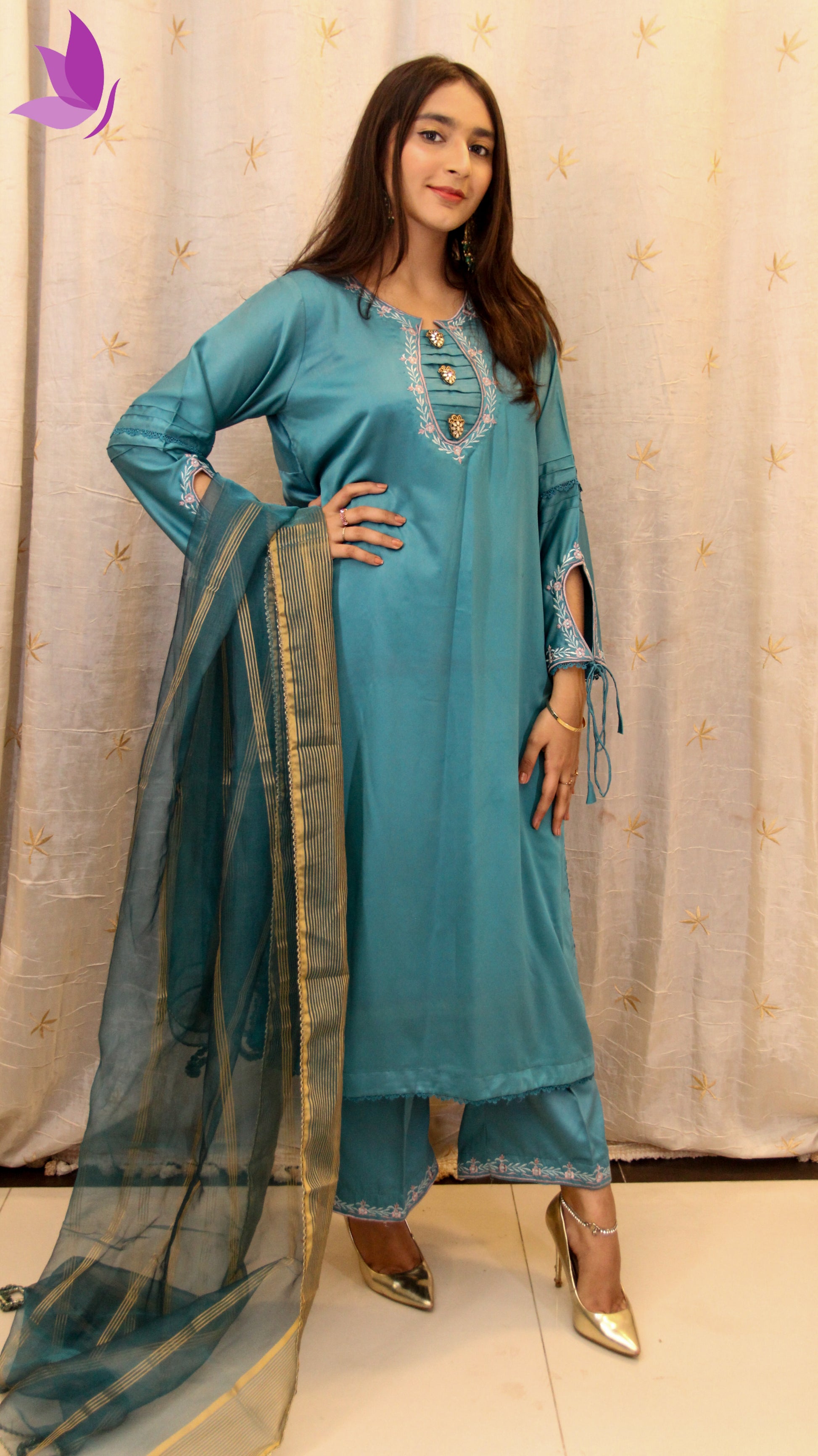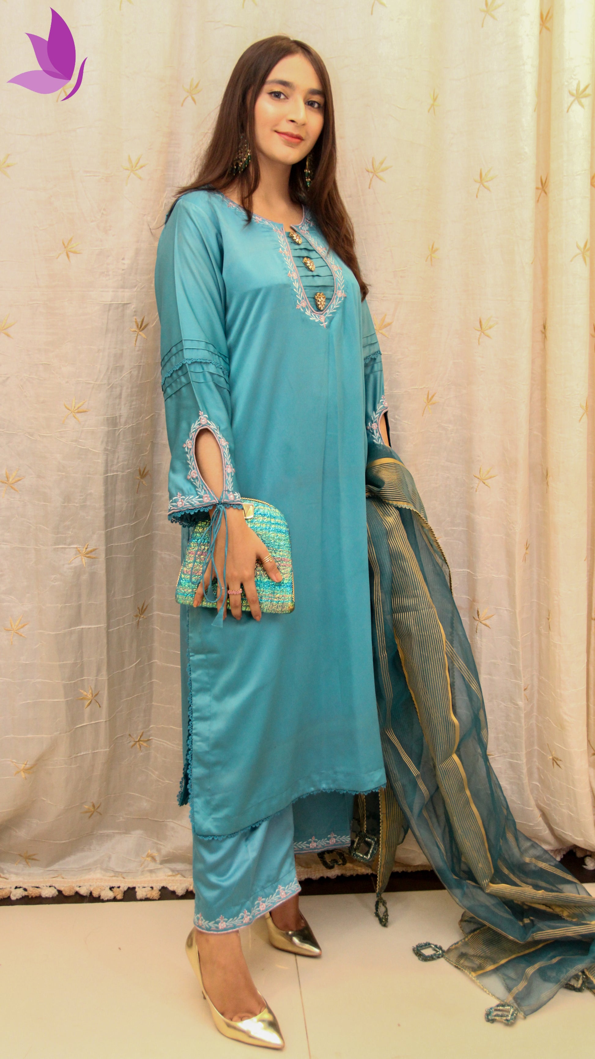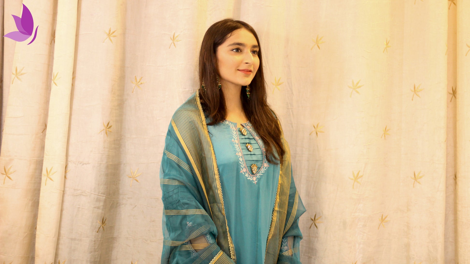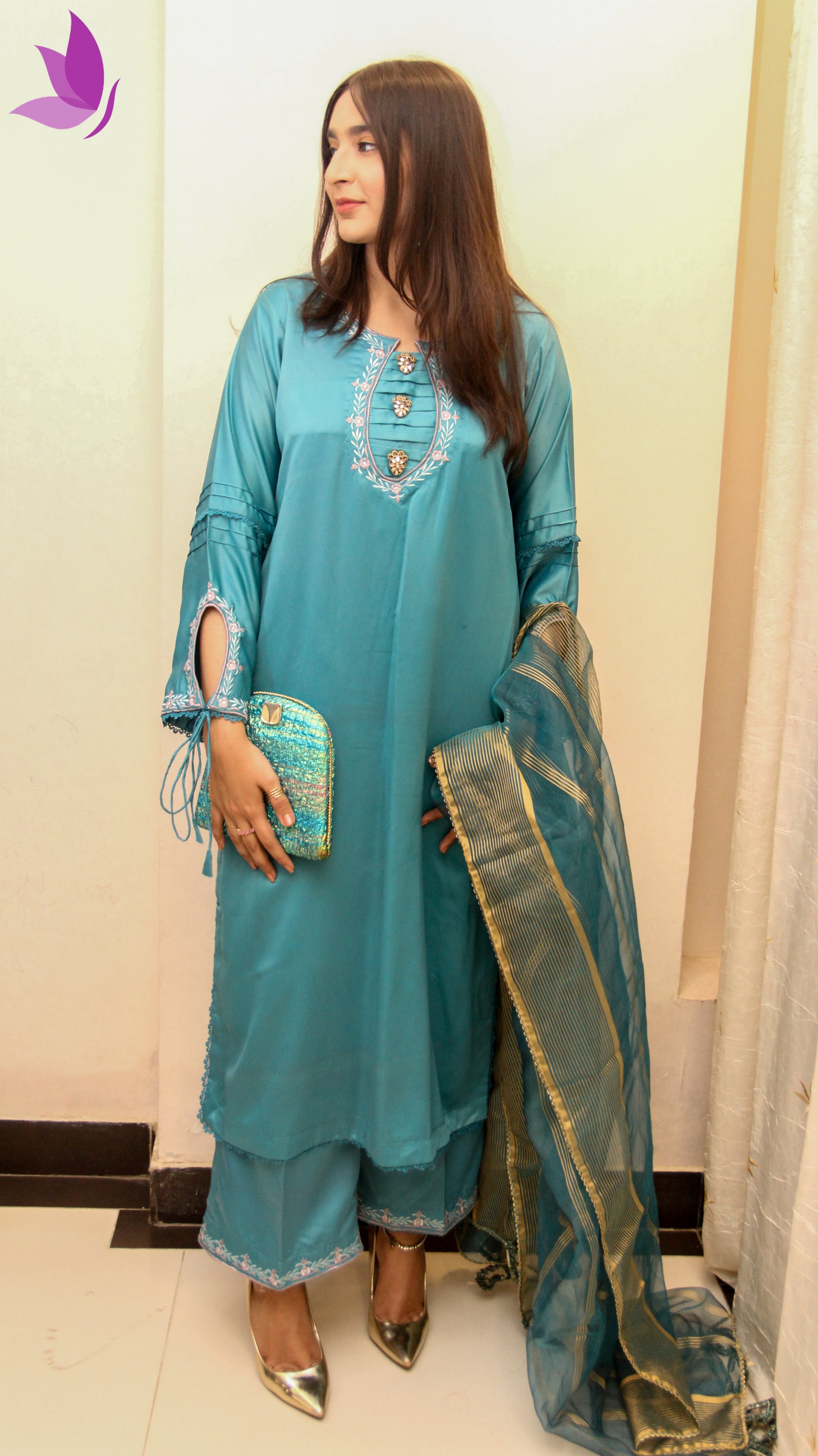 Breathe elegance with every step in the Ocean Mist Silk Set — a refreshing play of soft teal hues and glistening gold tones. The ensemble features subtle embroidery that enhances its fluid silhouette, while the sheer gold-striped dupatta adds an ethereal layer of sophistication.