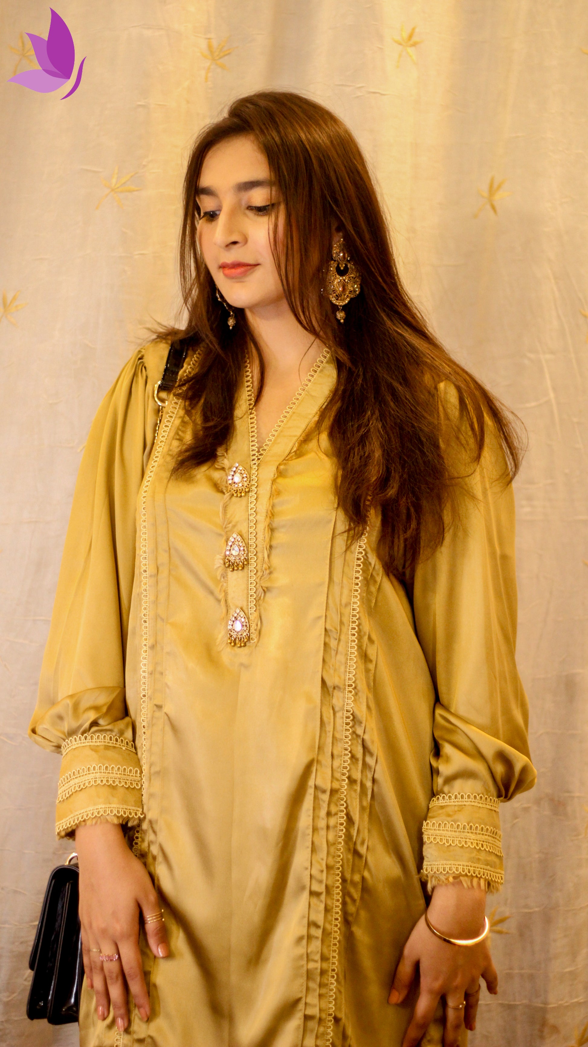 Step into understated luxury with our exquisite Golden Glow Tunic. This semi-formal kurta is designed to make you shine with its rich color and delicate embellishments, perfect for celebratory occasions and elegant gatherings.
