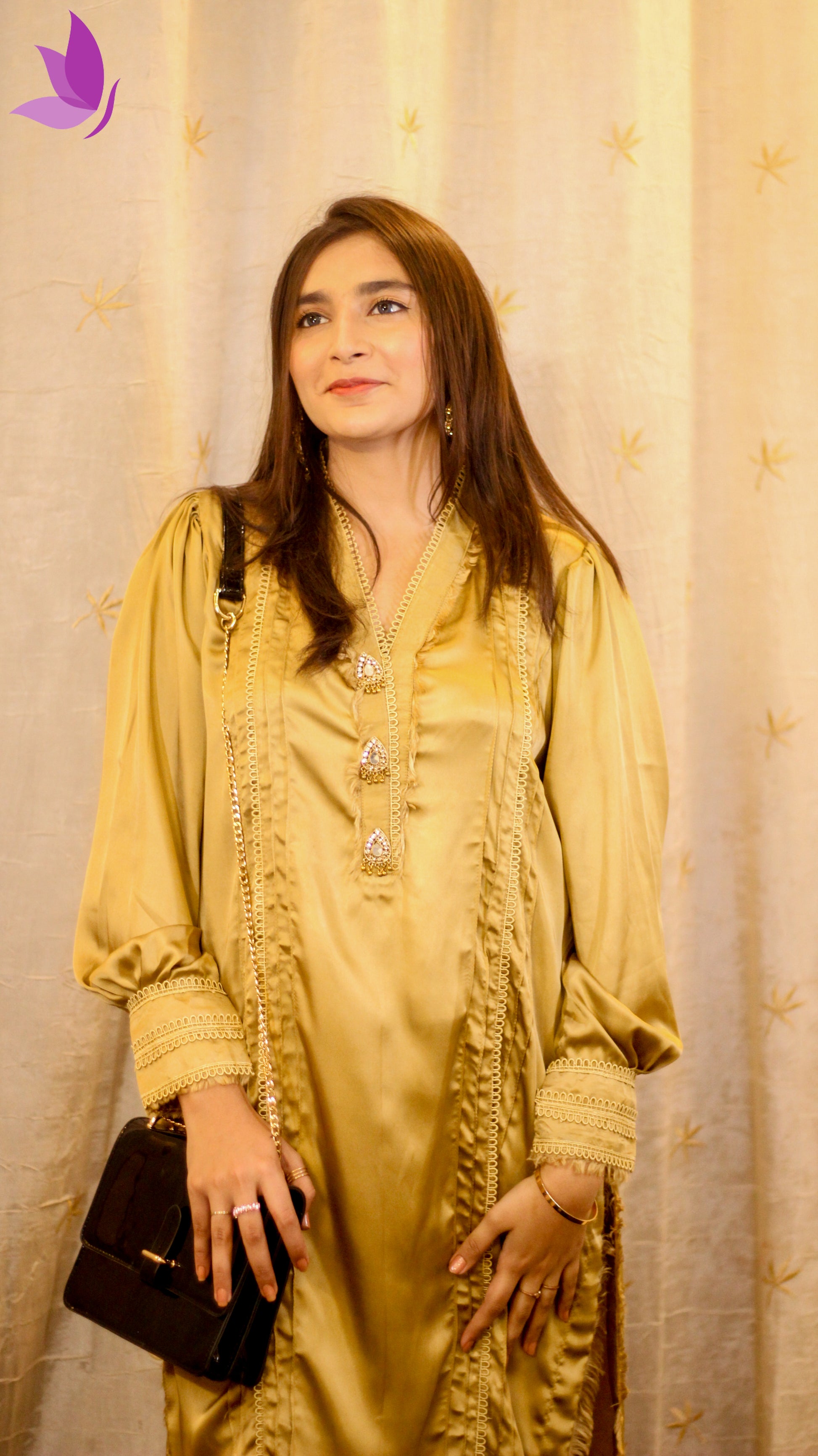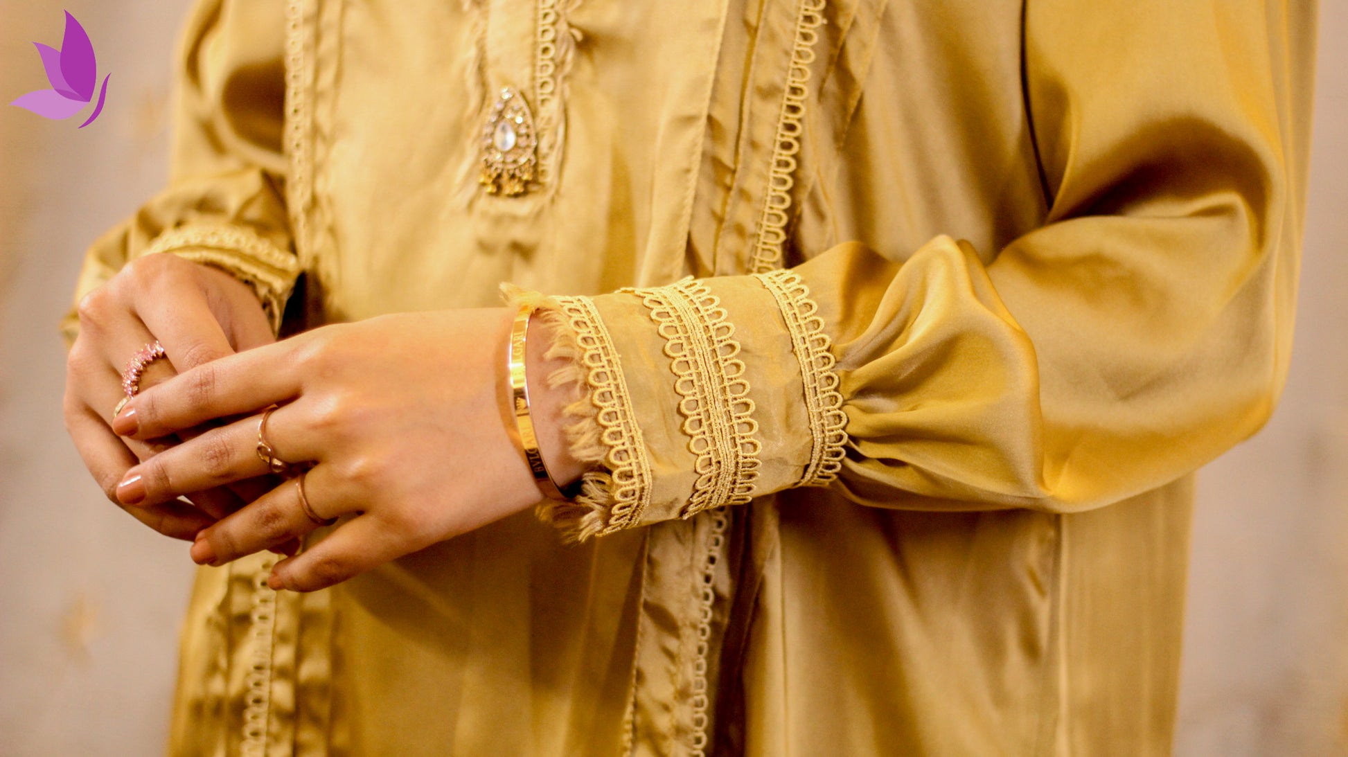 Color & Fabric: A captivating warm golden hue in a lustrous, premium blended fabric that drapes beautifully and has a subtle sheen (e.g., Silk Blend / Viscose Silk).