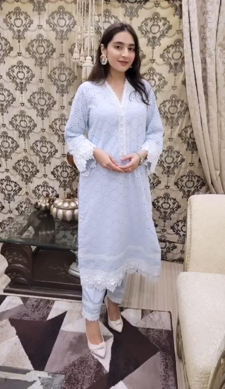 Design Highlights: The entire look is defined by intricate White English Lace detailing. This gorgeous trim adorns the deep V-neckline, the wide cuffs of the sleeves, and the hemline of both the kurta and the matching straight-cut trousers.