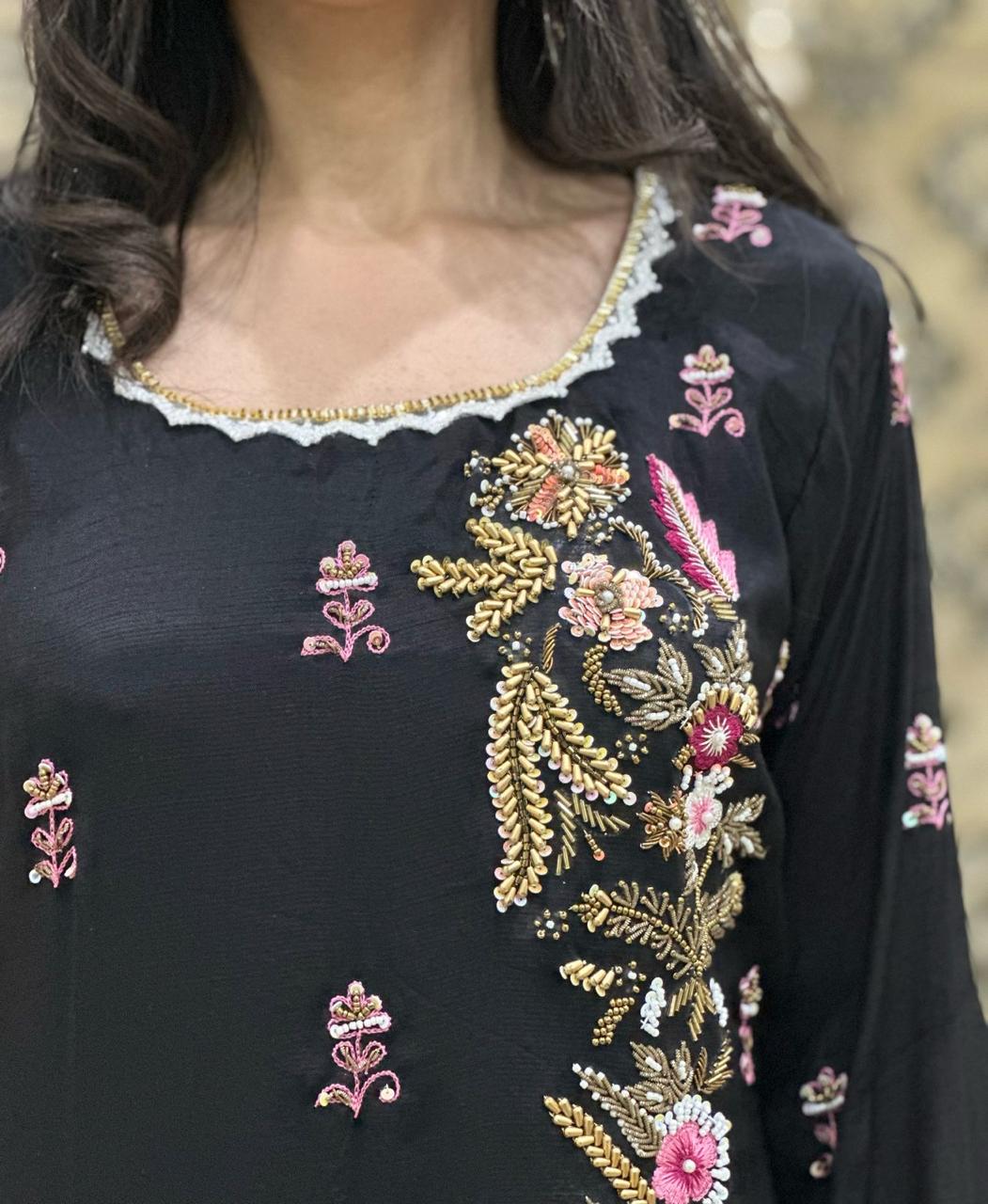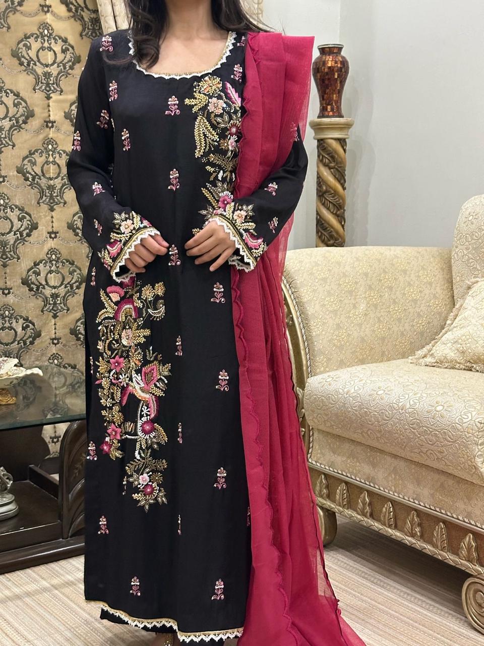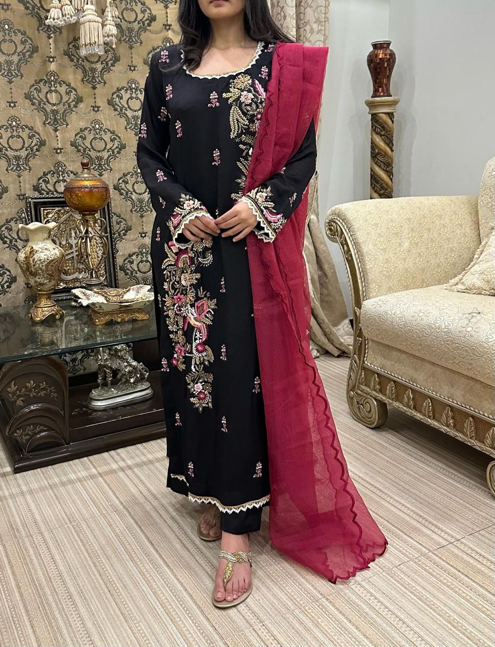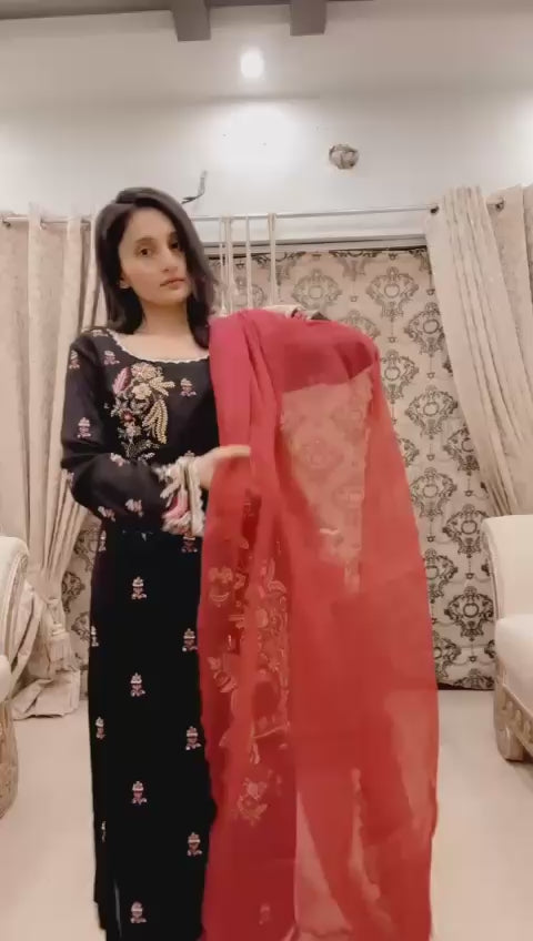 Make a statement in this classic black three-piece outfit, beautifully enhanced with intricate floral embroidery in pink and gold tones. The shirt features detailed work on the neckline, sleeves, and front, paired with a matching trouser for a graceful silhouette. The bold look is completed with a contrasting deep magenta dupatta, adding the perfect pop of color.