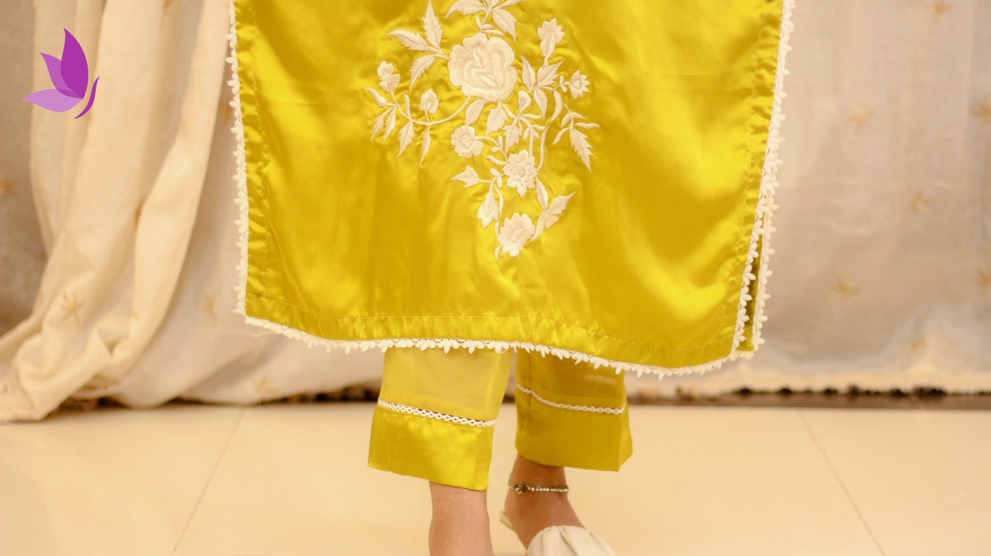 This vibrant ensemble combines a lively hue with delicate floral embroidery, creating a look that's both festive and gracefully modern.