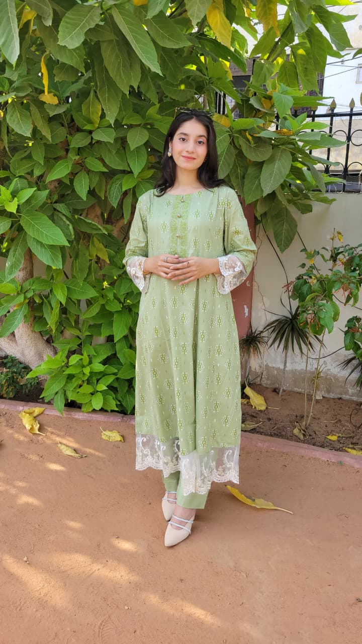 The straight-cut silhouette is enhanced with lace detailing on the sleeves and hem, giving it a refined feminine touch. Lightweight, breathable, and perfect for all-day wear, this outfit blends traditional charm with modern minimalism — ideal for casual gatherings, festive lunches, or day-to-day elegance.