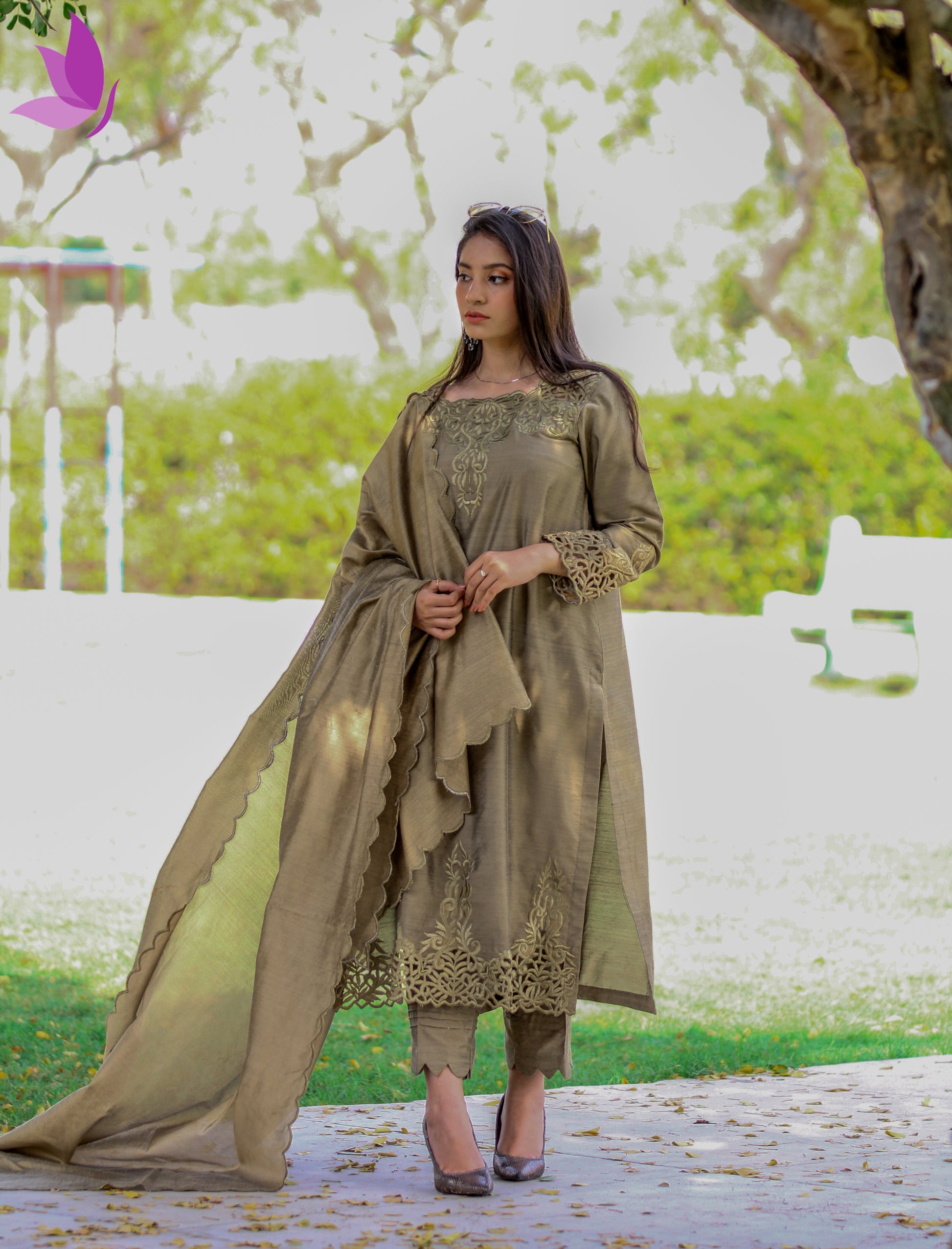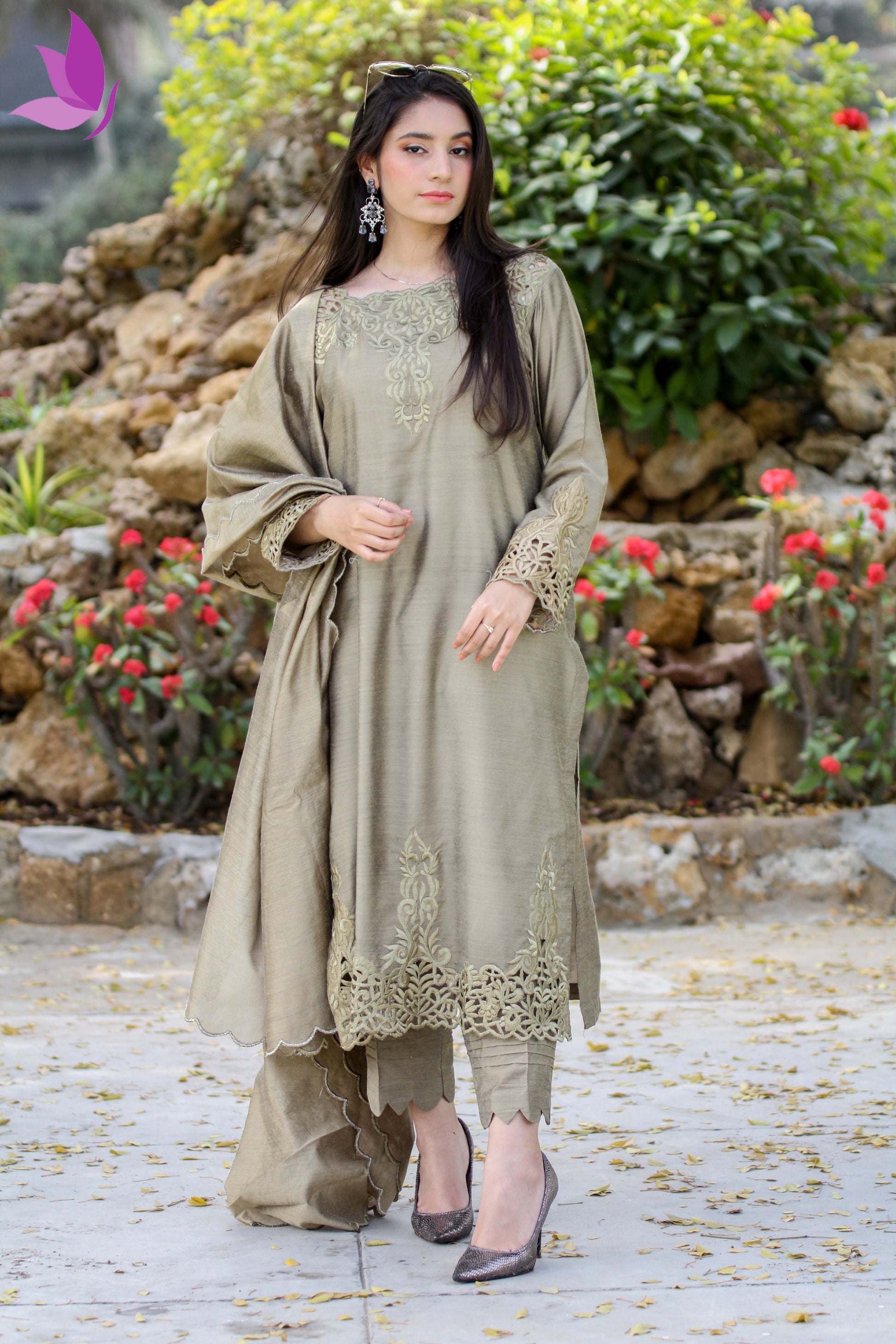 Step into timeless elegance with our olive formal 3-piece suit from Raisin Outfits. Designed for the modern Pakistani woman, this outfit combines comfort, style, and sophistication. The embroidered neckline, detailed sleeves, and scalloped hem create a refined look perfect for both casual gatherings and formal events.
